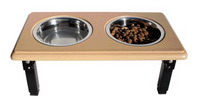 Adjustable height diner in attractive wood tones with 2 stainless steel bowls.