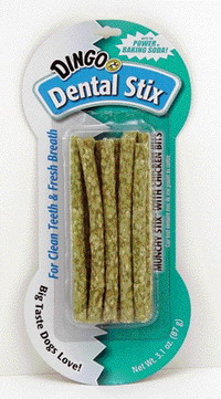 Dingo dental rawhide chews offer the same great taste as our Original dingo Munchy Stix with the added benefit of baking soda, chlorophyll and parsley seed for extra clean teeth and fresh breath.