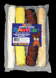 4 pack retriever rolls. Flavors: chicken, beef, peanutbutter. Great to use as a fetching stick. High protein snack.