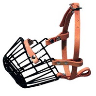 Plastic coated wire muzzle w/leather strapes and collar loop to prevent loss. Rugged durability, yet light and comfortable. Exclusive double nose protection. Will not rust or chip. Prevents nose and tongue from sticking in cold or burning in hot weather.
